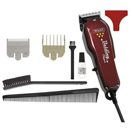 Powerful single cut clipper with surgical blades for full head balding· Twice the speed of pivot motor clippers· Includes 2 cutting guides (1/16 inch - 3/16 inch)· Includes black barber comb, pre-shave brush, red blade guard, oil, cleaning brush.